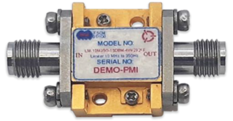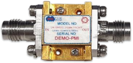 PMI Model No. LM-10M50G-18DBM-4W-24FF is a 10 MHz to 50.0 GHz, Limiter It has a typical recovery time of 100 ns and a maximum VSWR of 2.0:1. It has 2.4 female connectors in a housing measured at 0.53" x 0.70" x 0.26".