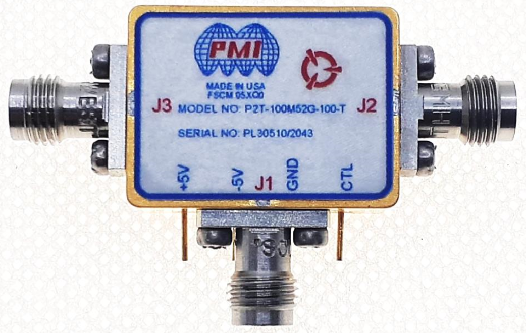 PMI Model No. P2T-100M52G-100-T is a 0.1 to 52.0 GHz, Single Pole, Two Throw, Absorptive Swtich. It has a typical insertion loss of 6.0 dB and a typical isolation of 100 dB. The housing is measured at 1.00" x 0.75" x 0.40" and has 2.4 mm female connectors.