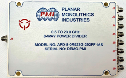 PMI Model No. APD-8-0R523G-292FF-MS is an 8-Way Power Divider that operates over the 0.5 to 23.0 GHz frequency range. It has a maximum insertion loss of 8.0 dB and a typical isolation of 15 dB. This model is outfitted with 2.92 female connectors in a housing measuring 5.00" x 3.70" x 0.43".