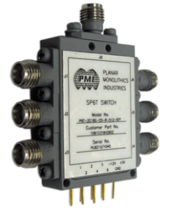 PMI Model No. P3T-89-45-R-SFF is a Single Pole, Three Throw, Reflective Switch that operates over the 8.0 to 9.0 GHz frequency range. It has a maximum insertion loss of 2.7 dB and a minimum isolation of 45 dB. This model is outfitted with SMA female connectors in a housing measuring 2.00" x 1.25" x 0.40".